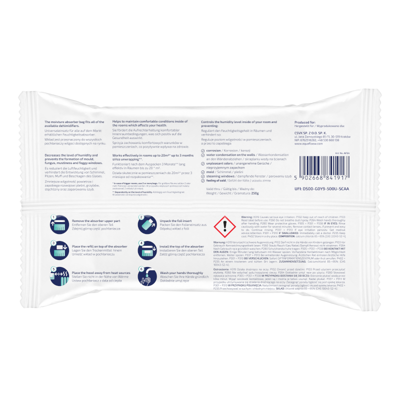Zadbaj o zdrową przestrzeń wokół siebie i swoich bliskich. Postaw na zestaw 4 wkładów do pochłaniacza wilgoci AquaFloow ReFiller 250 g – praktyczne, ekonomiczne i skuteczne rozwiązanie w walce z wilgocią w każdym pomieszczeniu.